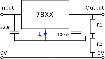 If the regulator's output voltage is VXX and the Quiescent current is IQ then the output voltage is given by: