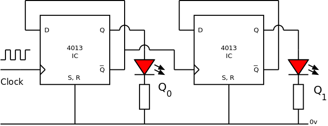 This counter can only count from 0 to 1 i.e. one clock pulse. After the circuit has been reset the output will be LOW. When 1 clock pulse has been received the output will be HIGH. The next clock pulse makes the output go LOW again. The output of the 1 Bit counter is Q0.
