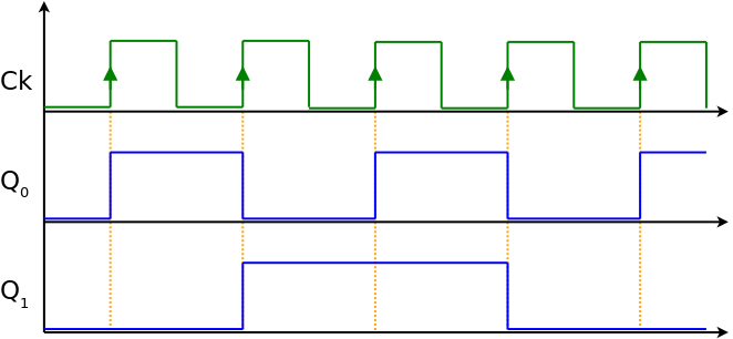 On the 2nd rising edge of the CLOCK, Q0 goes LOW and Q1 goes HIGH representing binary 1 0
