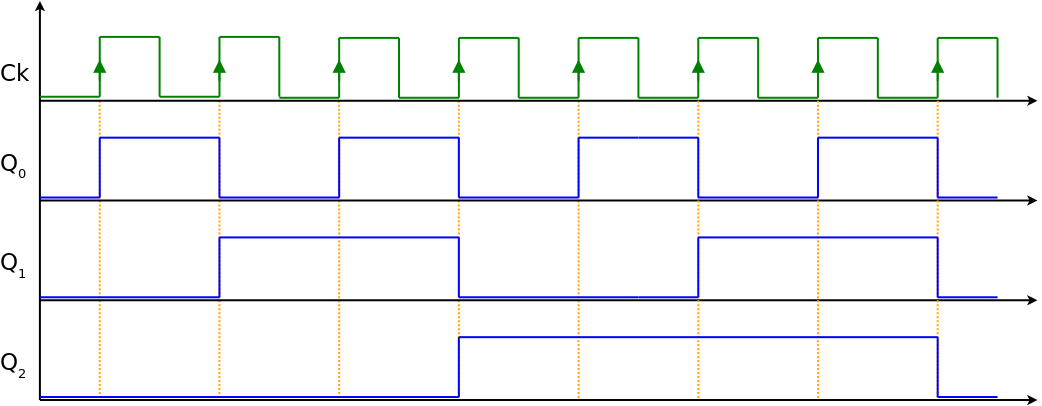 The timing diagram shows the state of the three outputs Q0, Q1 and Q2