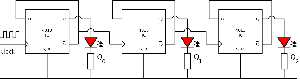 Binary counters are available as an all-in-one IC such as the generic counter shown in the diagram.